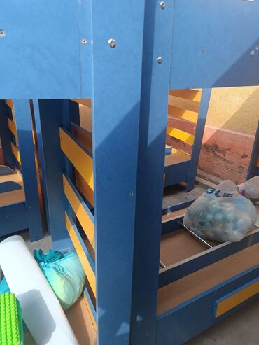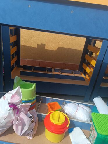 - Комплектация по фото: каркас кровати (два уровня), соединительная и крепёжная фурнитура, металлические поперечные стержни-усилители. На фото также видны детские пластиковые контейнеры/ведёрки и постель/одеяла — ориентируйтесь по изображению, что именно входит.