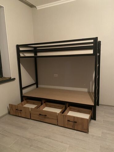 Двухъярусная кровать с металлическим каркасом черного цвета и деревянным основанием. Нижний ярус оснащен тремя выдвижными ящиками с деревянными фасадами и металлическими ручками. Лестница для подъема на второй ярус также выполнена из металла. Конструкция кровати позволяет эффективно использовать пространство в комнате, обеспечивая два спальных места и дополнительное место для хранения вещей.