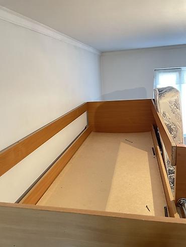 Двухъярусная кровать из ламинированного дерева с металлическими перекладинами-лестницей сбоку и защитными бортиками на верхнем ярусе. Внизу — два выдвижных ящика для хранения. В комплекте может идти матрас, также возможна покупка матраса отдельно (указано на фото).