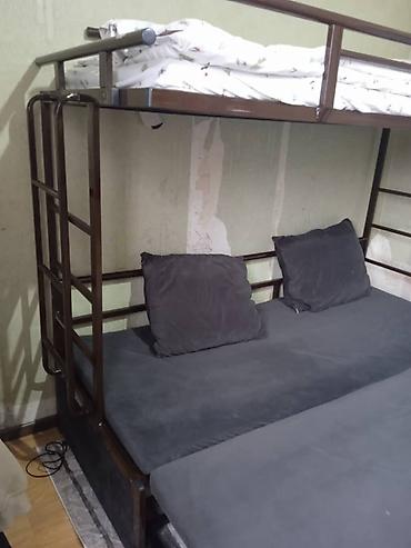- Матрасы/мягкие элементы: верхний ярус укомплектован наматрасником/постелью, нижний — многосекционные мягкие модули с чехлами темно‑серого цвета.