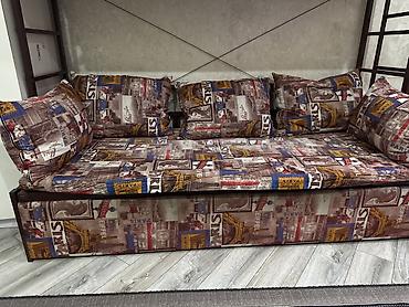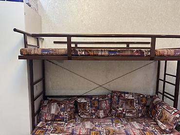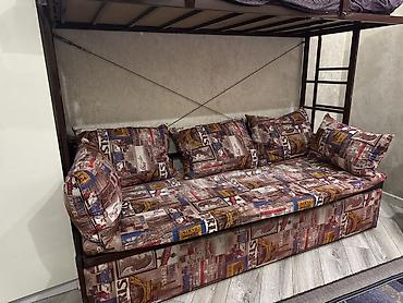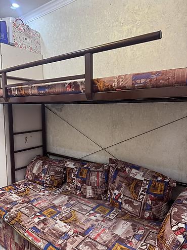Двухъярусная металлическая кровать-диван с мягкими матрасами и подушками