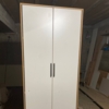 Белый шкаф с двумя дверцами и минималистичным дизайном. Внутри расположены полки и штанга для удобного хранения одежды и других вещей. Шкаф идеально подходит для организации пространства в спальне,...