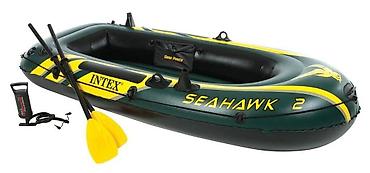 Лодка Intex Seahawk 2 поставляется с веслами, насосом, двумя лодочными уключинами, ремкомплектом и имеет цветовую гамму темно-зеленого и желтого цветов.