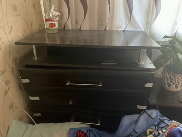 Дополнительно на фото — прикроватная тумба в том же темном цвете: три выдвижных ящика с горизонтальными ручками и верхняя полка на металлических стойках.