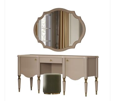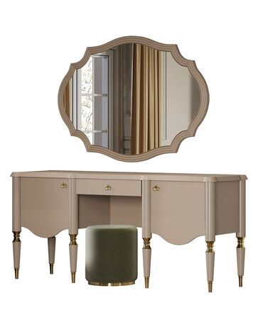 Нарядный столик на изящных резных ножках имеет два отделения за распашными дверцами по бокам и выдвижной ящик в центре, дополняется большим навесным зеркалом в фигурной раме. Такое наполнение поможет вам разместить косметику, парфюм и все необходимые инструменты для создания причесок и макияжа.,