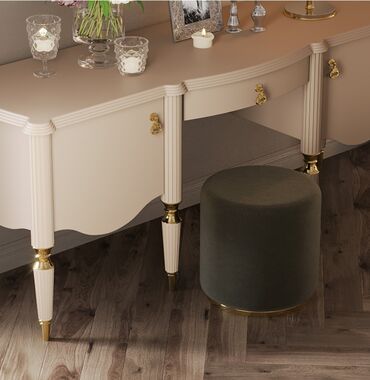 Особенно комфортным процесс прихорашивания делает компактный и удобный пуфик в нежной велюровой обивке.