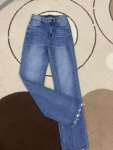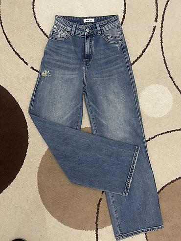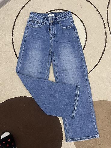 2) Джинсы голубого оттенка, прямые, высокая посадка. Пять карманов, пояс со шлевками, молния и пуговица. Равномерный выбеленный эффект по бедру, аккуратная прострочка по швам и низу.