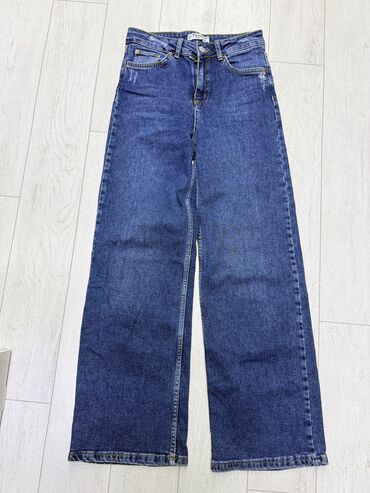 Джинсы прямого кроя женские - Свободный силуэт с прямой широкой штаниной - Средняя посадка - Классический голубой деним без сильных потертостей - Пять карманов: два спереди, маленький монетный и ...