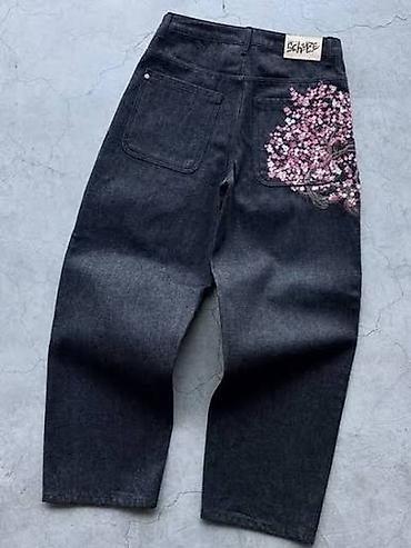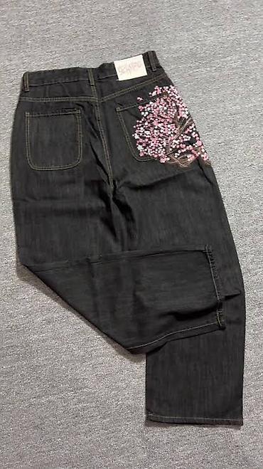 - Дизайн: детальная объёмная вышивка ветвей и цветков сакуры розово‑белых оттенков на правом заднем кармане и у переднего кармана; фирменный кожаный патч с логотипом на поясе сзади.