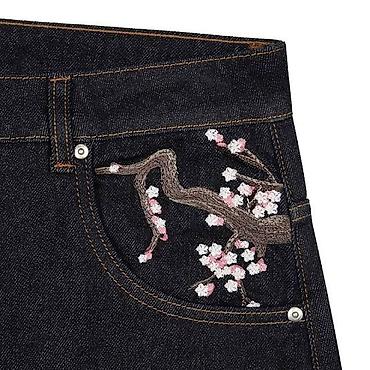 Джинсы Сакура из плотного тёмно‑синего денима с вышивкой «Сакура». -