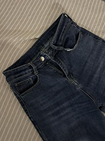 Джинсы темно‑синего денима (индиго), классический крой с зауженной штаниной.