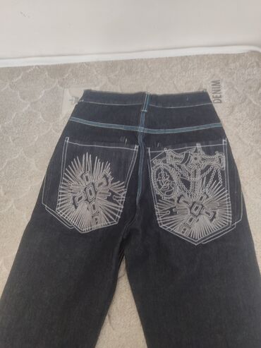 - На задних карманах — крупная светлая вышивка с графичными узорами.