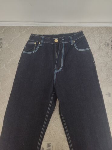 Джинсы из плотного тёмно-синего денима с декоративной контрастной строчкой.