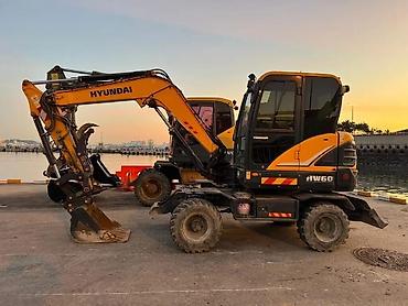 Экскаватор-погрузчик Hyundai HW60 на колёсном ходу. Характеристики и особенности: - Модель: Hyundai HW60 (колёсный экскаватор компактного класса). - Дизельный двигатель, верхняя поворотная платфор...