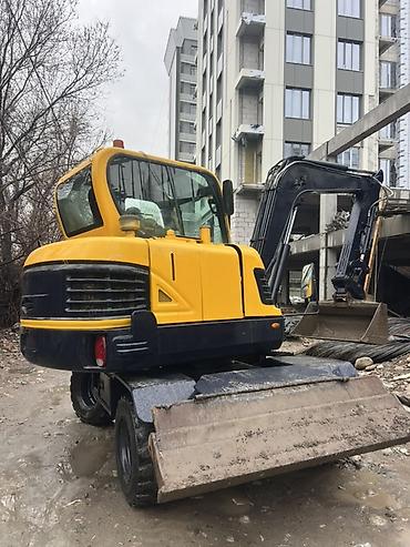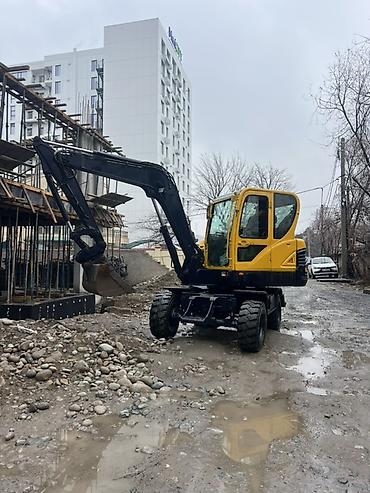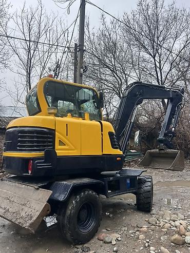 Колесный экскаватор с гидравлическим ковшом - Тип: компактный колесный экскаватор - Привод: гидравлическая стрела, рукоять и ковш - Кузов: кабина оператора с панорамным остеклением, защитные поруч...