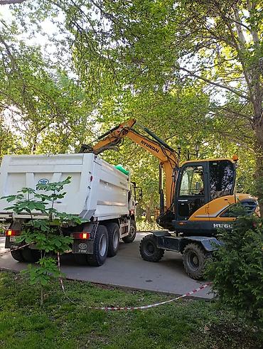 Техника работает в связке «экскаватор + самосвал» или по отдельности. Аккуратная работа в стеснённых условиях двора/коттеджного участка. Возможна погрузка на месте и оперативный вывоз.