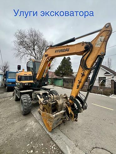 Услуги экскаватора Hyundai (колесный) по г. Бишкек и окрестностям. Текст на фото: «услуга экскаватора по Бишкек Район Жал Село жал АК Ордо ТЦ 2 Кашка баш Кунту Шалта». Возможные работы: - землерой...