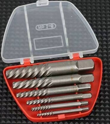 Платная доставкаСамовывозНабор экстракторов для выкручивания обломанных болтов. Есть два вида на выбор. Черные - 350 с. Серые - 400 сом. Набор из 6 шт. Новый. В пластиковом кейсе. Телефон О 7 О 7 66 88 09