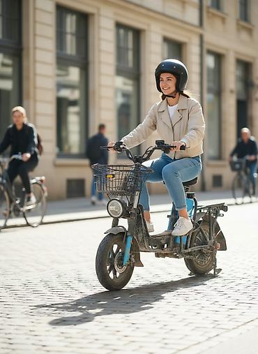 Электровелосипед/электроскутер городского типа - Компоновка: низкая рама с широкой подножкой, передняя корзина для багажа, центральная подножка, задний багажник-сиденье пассажира. - Посадка: два р...
