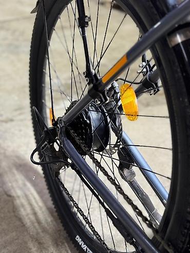Городской/туринговый велосипед с установленным электрокитов и полезными аксессуарами. Основные характеристики и оснащение: - Рама хардтейл, колеса 26". - Установлен электропривод (электрокит): дви...