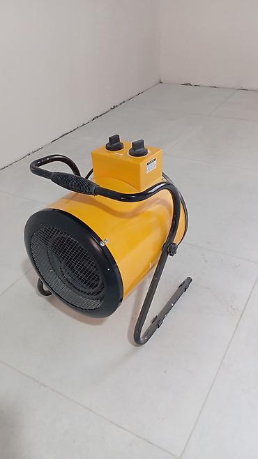 Электрическая тепловая пушка 5 kW Описание: - Напольная тепловая пушка цилиндрической формы на устойчивой металлической раме (желтая подставка). - Мощность: 5 kW (указано на панели). - Питание: от...