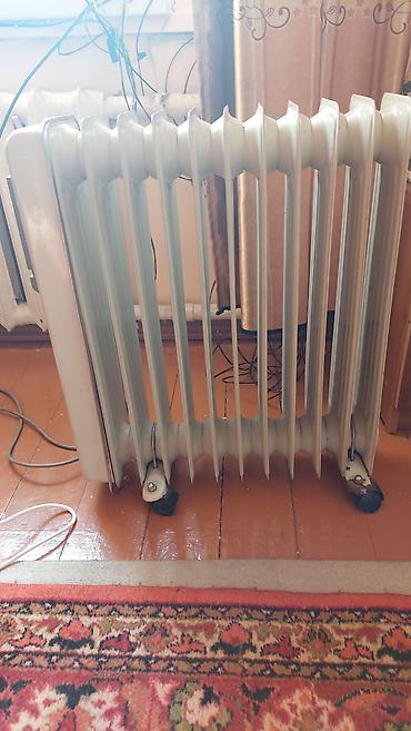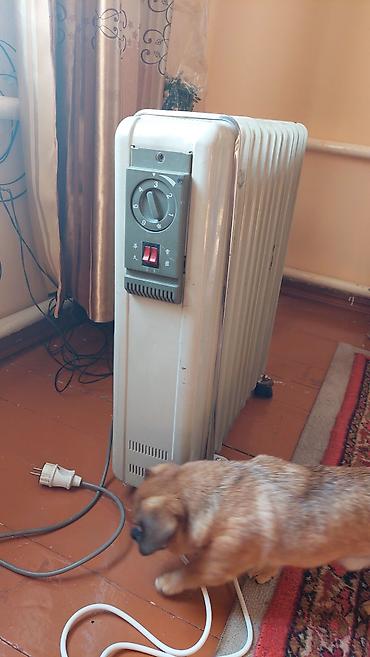 Дополнительно на фото — масляный электрический радиатор-обогреватель на колесиках с регулятором и кабелем питания: многосекционный, для обогрева комнаты.
