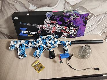 Комплектация на фото: бластер, бункер‑магазин, насадка на ствол, прицел, аккумулятор, USB‑кабель, пакет шариков, оригинальная коробка.