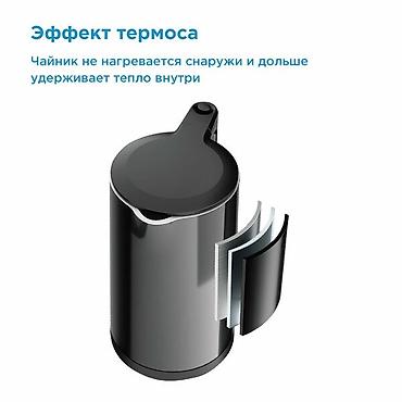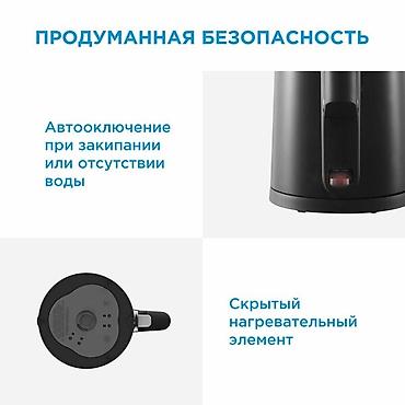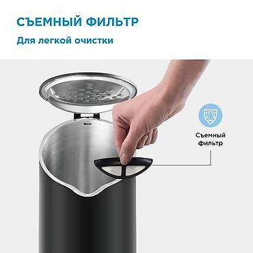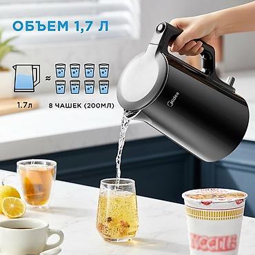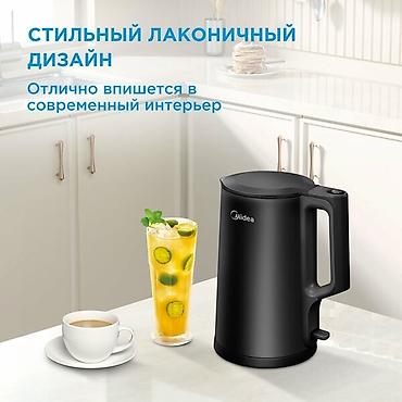 Чайник Midea в черном корпусе. Объем 1.7 литра, мощность 2200 Вт, что обеспечивает быстрое кипячение воды. Корпус с двойными стенками позволяет дольше сохранять тепло и предотвращает нагрев внешней поверхности. Крышка открывается на 75 градусов, что удобно для наполнения и очистки. Съемный фильтр для очистки воды от накипи.