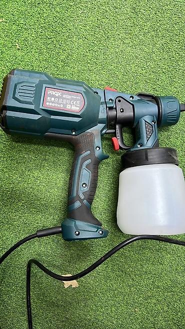 Бренд: PROX. Тип: электрический краскораспылитель с нижним бачком. Цвет корпуса: темно-зеленый/черный с красными элементами управления.