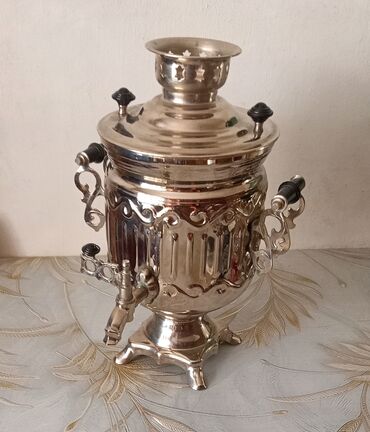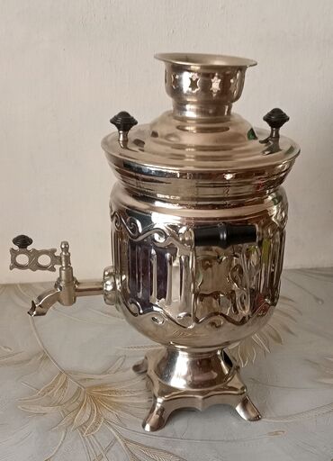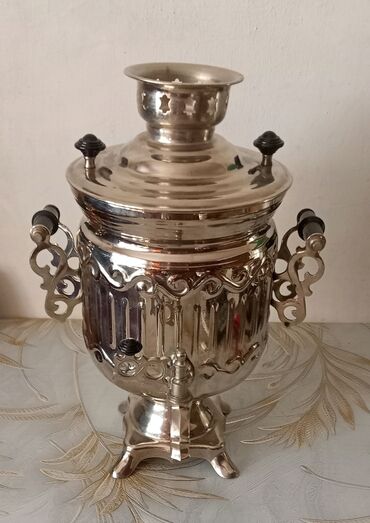 Электрический самовар из нержавеющей/никелированной стали с классической формой «ваза». В не рабочем состоянии, нужно заменить спираль. Характеристики: - Питание от сети, шнур в тканевой оплётке с...
