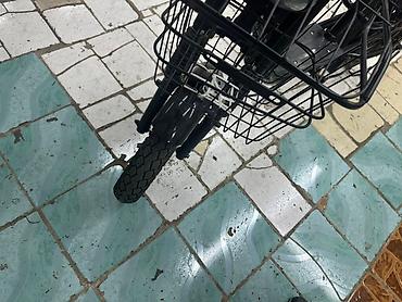 Электрический велосипед черного цвета. Оснащен передней корзиной и задней багажной платформой с бортиками для перевозки грузов. Регулируемое по высоте сиденье. Подходит для поездок по городу и перевозки небольших грузов.
