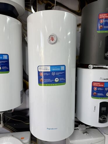 Белый электрический водонагреватель цилиндрической формы, предназначенный для бытового использования. Модель оснащена термометром для контроля температуры воды и имеет индикацию рабочего состояния. Подходит для установки в ванных комнатах, на кухнях или в подсобных помещениях, обеспечивая постоянный доступ к горячей воде.Электрический водонагреватель белого цвета, вертикальной установки, с логотипом "GARANT" на лицевой стороне. Обладает прямоугольным корпусом с закругленными углами, что делает его компактным и эстетичным для различных интерьеров. Модель оснащена нижним блоком управления, обеспечивающим легкий доступ к настройкам. Идеально подходит для обеспечения горячей водой частных домов, квартир или небольших офисов.Электрический водонагреватель белого цвета, вертикальной установки, с логотипом "Aqualuxe" в нижней части лицевой стороны. Оснащен информационным стикером с указанием срока гарантии и QR-кодами, предоставляющими дополнительную информацию о продукте. Цилиндрический корпус обеспечивает эффективный нагрев воды. Подходит для использования в бытовых условиях, обеспечивая надежное и стабильное горячее водоснабжение.
