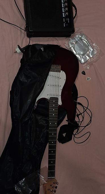 Отличный набор для начала игры: все необходимое — от инструмента и медиаторов до усилителя и чехла. Цвет гитары — темно‑красный с белым пикгардом.