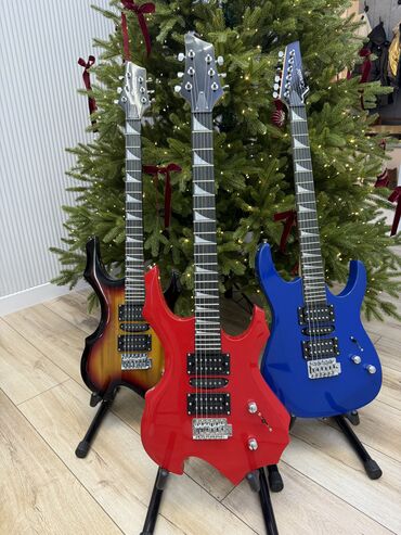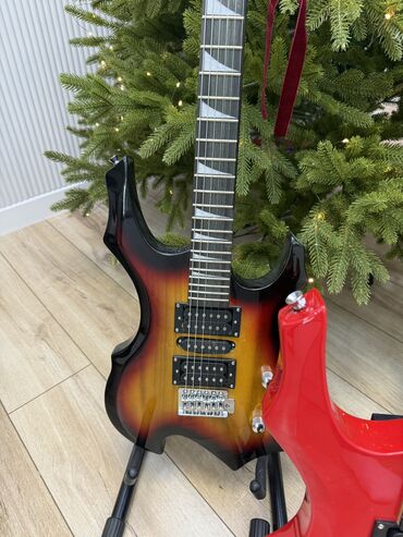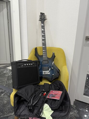 Электрогитара в комплекте с комбоусилителем 20ват, струны, плотный чехол, 3 медиатора, ремень, крепление на стену, кабель, переходник. Новая, тип Warlock и Soloist. Выглядит эффектно. Звук мощный. Гриф ровный.