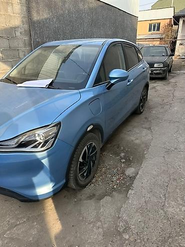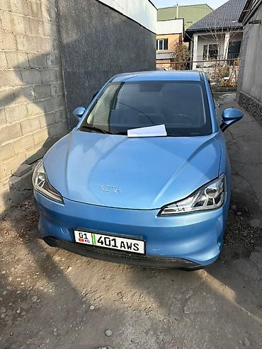 Электромобиль NETA (синий хэтчбек/кроссовер) на киргизских номерах.