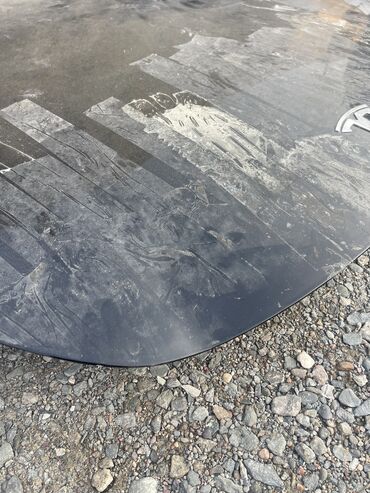 Капот автомобиля, белый, с центральной вентиляционной вставкой/жалюзи. Материал — металл. На правой стороне имеется участок с сильными повреждениями и трещинами, по поверхности видны царапины и сле...