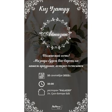 Онлайн жумуш чакыруу кат жасаганды уйротобуз жана жасайбыз Онлайн Изготовление приглашений фото/видео для свадьбу Что предлагаем: - Дизайн и печать приглашений на свадьбу и «кыз узатуусу» (провод...
