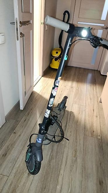 Электросамокат с передней фарой и дисплеем на руле. Складная конструкция с фиксатором, удобна для переноски и хранения. На рулевой стойке наклейки; установлены серые грипсы. Колёса безкамерные с перфорацией (антипрокол), передний мотор‑колесо с дисковым тормозом/ножным крылом-самокатом, крылья спереди и сзади. Проводка защищена гофрой. Платформа с противоскользящим покрытием.