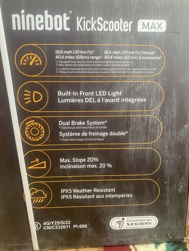 На изображениях — оригинальная коробка Ninebot KickScooter G30PMAX с иллюстрацией самоката и основными характеристиками.