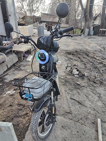 - Компактный городской электроскутер с передней корзиной и задним кофром для вещей.