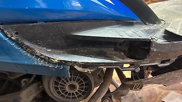 - На правом боковом пластиковом обтекателе есть следы ремонта и сколы/трещины в районе подножки и воздухозаборника.