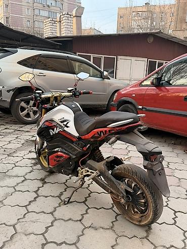 Электроскутер (кастом) - Тип: электрический скутер/мопед с дорожной посадкой - Дизайн: агрессивный стрит-стиль, чёрный кузов с графикой; красные акценты на руле, тормозных рычагах и перьях вилки -...