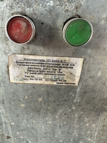 - Конструкция: металлический корпус, выносная рукоять для переноски, сетчатые защитные экраны, ТЭН-блок, осевой вентилятор, панель управления с кнопками Пуск/Стоп (зеленая/красная).