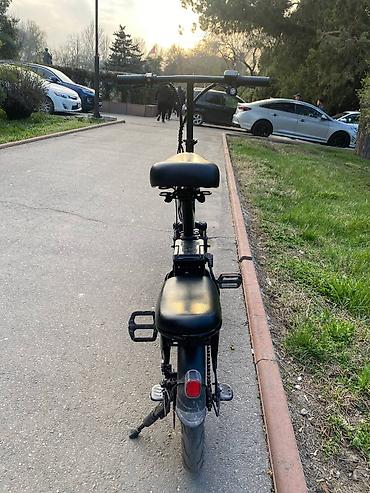 Электровелосипед/электроскутер городской, компактная рама с низкой посадкой и площадкой для ног. Черный цвет. Ключевые особенности: - Электропривод на заднем колесе (мотор-колесо), цепи/кардана не...