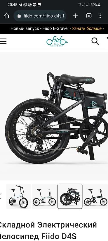 Электровелосипед Fiido d4s в идеальном состоянии. Складной, колёса 20 дюймов, мотор 250 Вт, батарея 36В, 10.4 А/ч. Макс. скорость 37 км/ч. Дальность без педалей 30-40 км, с педалями 70-80 км. Вес: 18.5 кг. Цвет чёрный. Европейский бренд. Лучший городской складной электровелосипед. Подробные обзоры в YouTube. Цена: 55000 сом.