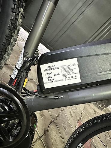 - Аккумулятор: съемная батарея на раме. На шильдике указано JUNGLE/JUNGLA, 36V 25Ah (также отмечено 48V), 2024 г. Большая емкость для длительных поездок. Зарядный разъем сбоку, замок фиксации.