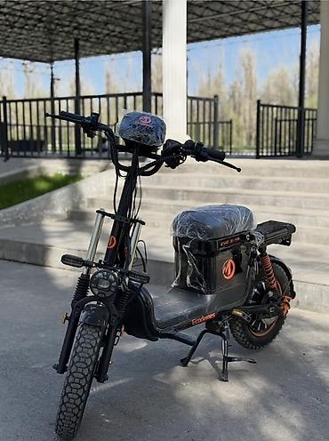 Электровелосипед (скутерного типа) - Компоновка: низкая рама с платформой для ног, удобное седло со спинкой, задняя площадка/багажник. - Передняя корзина для вещей, крупная фара головного света. -...