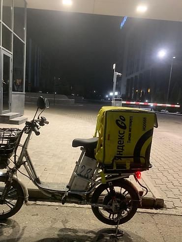 Электровелосипед/электроскутер с баулом курьера Описание: - Компактный городской электровелосипед с низкой посадкой и широкой подножкой. - Сзади установлен фирменный термобокс «Яндекс Go» для дост...