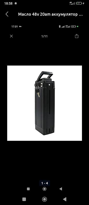 - Съёмный аккумулятор в кейсе с ручкой и замком-ключом. На фото показан тип АКБ 48V 20Ah (форм-фактор «бутылка/кейс»).