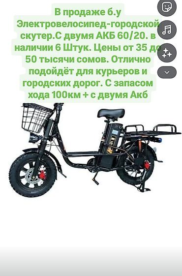 В продаже б.у Электровелосипед-городской скутер.С двумя АКБ 60/20. в наличии 6 Штук. Цены от 35 до 50 тысячи сомов. Отлично подойдёт для курьеров и городских дорог. С запасом хода 100км + с двумя Акб.